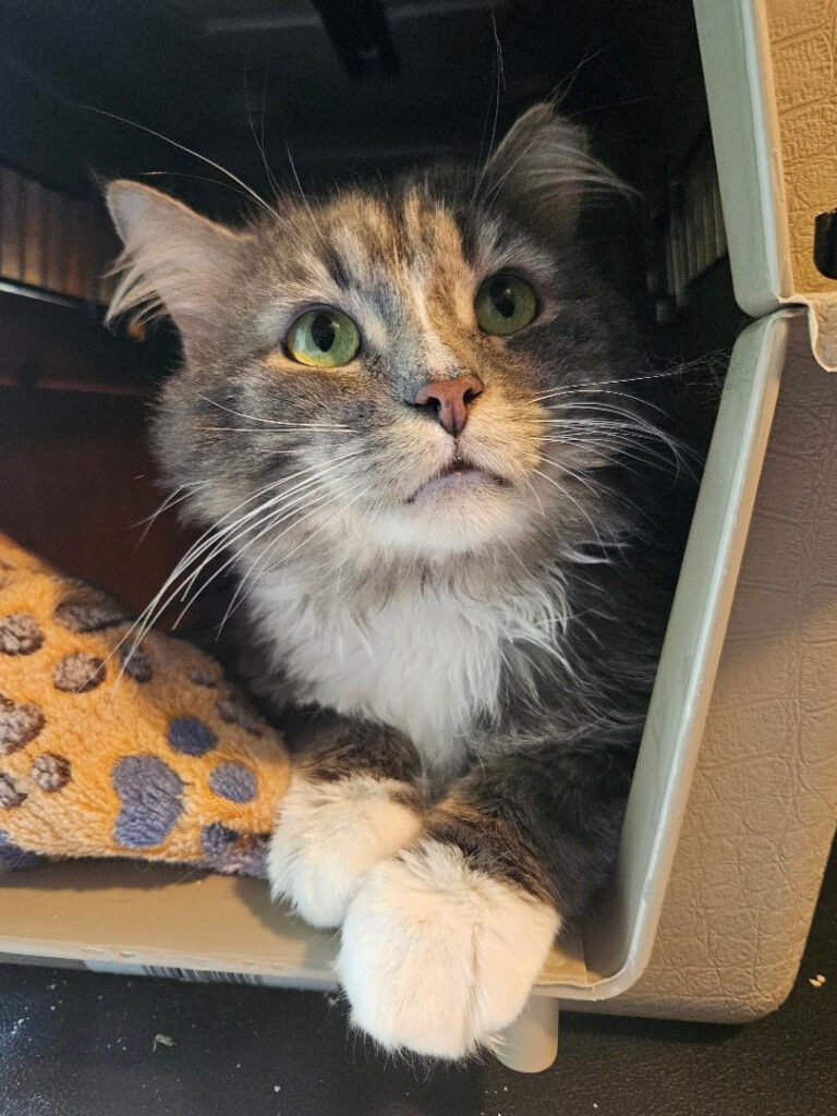 This stunning long-haired gray and white tabby had been appearing on and off on the yard cam. She didn’t know if he was friendly or feral. Regardless, he needed to be neutered. Sherman came through the TNR surgery just fine and decided to show that he was indeed a sweet, friendly cat.